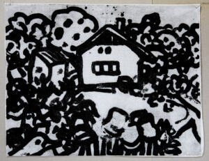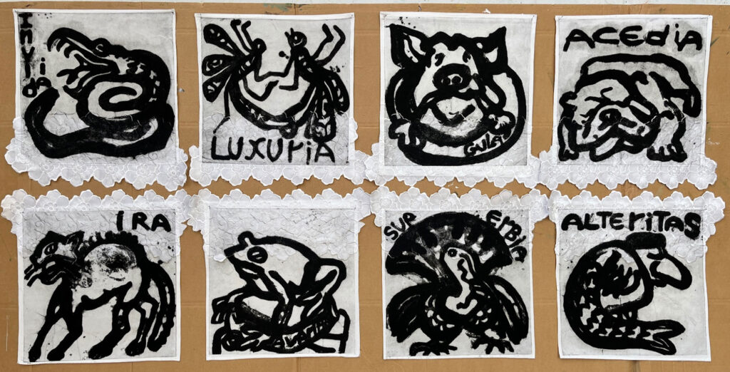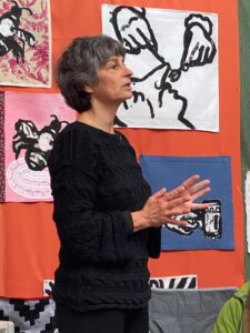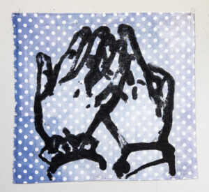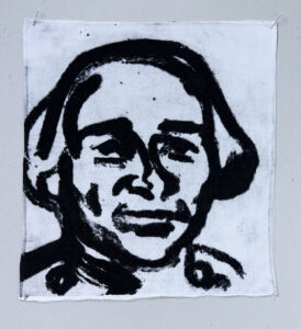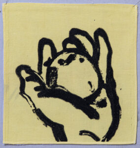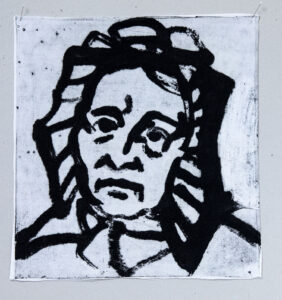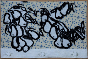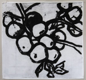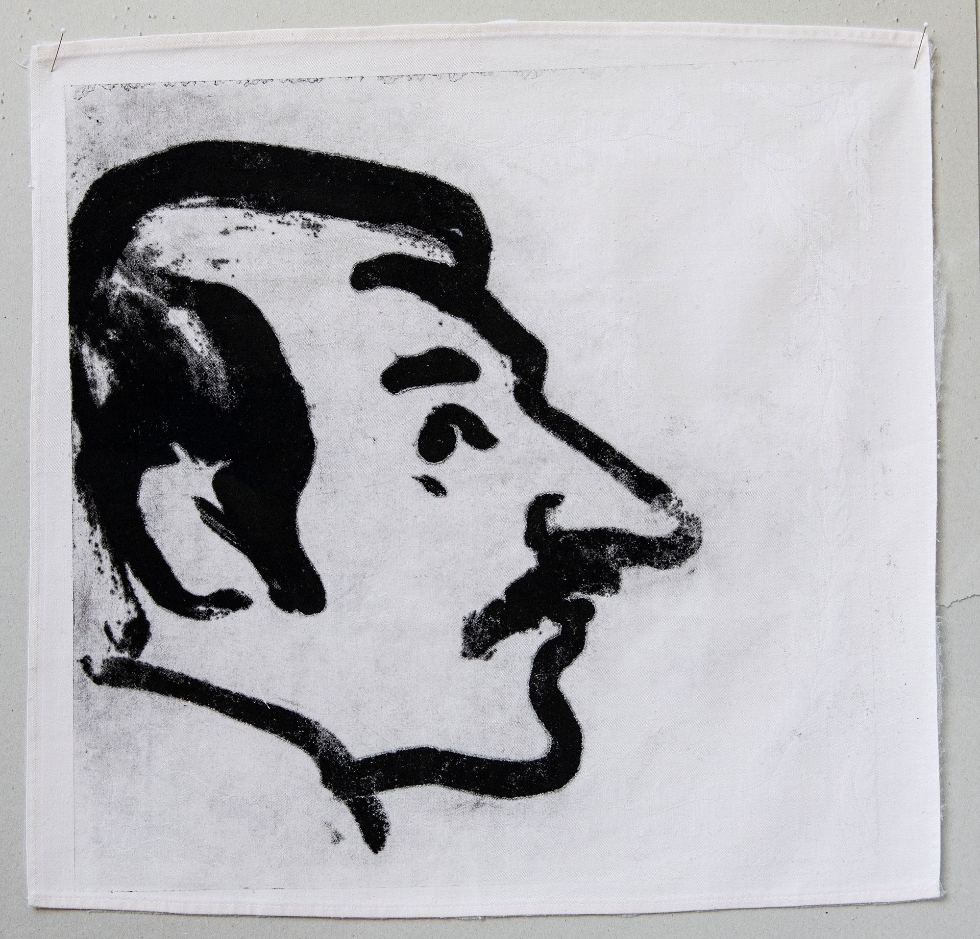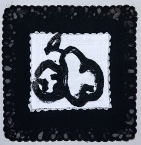 The works in this series are made in the carborundum printing technique on all types of household textiles. Many of the images are based on my own household objects and some textile prints are finished on traditional lacework.